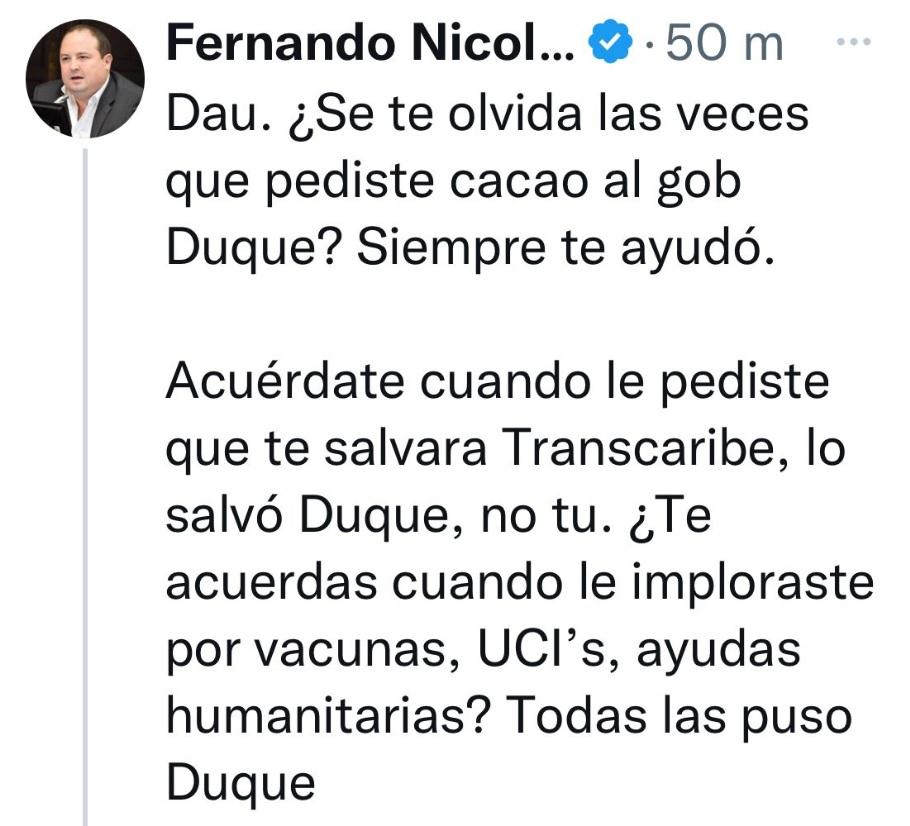 Los trinos fueron contundentes y uno a uno le recuerdan a Dau cuando tocó las puertas del gobierno Duque y amablemente se le abrieron.