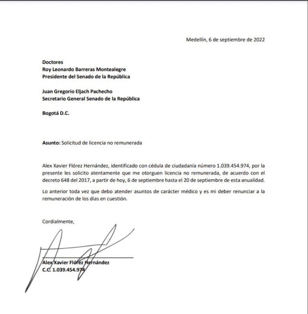 En la tarde del martes 6 de septiembre, se conoció una carta firmada por el congresista Álex Flórez, quien pide al presidente del Congreso, Roy Barreras y el secretario del Senado, Gregorio Eljach, una licencia no remunerada.