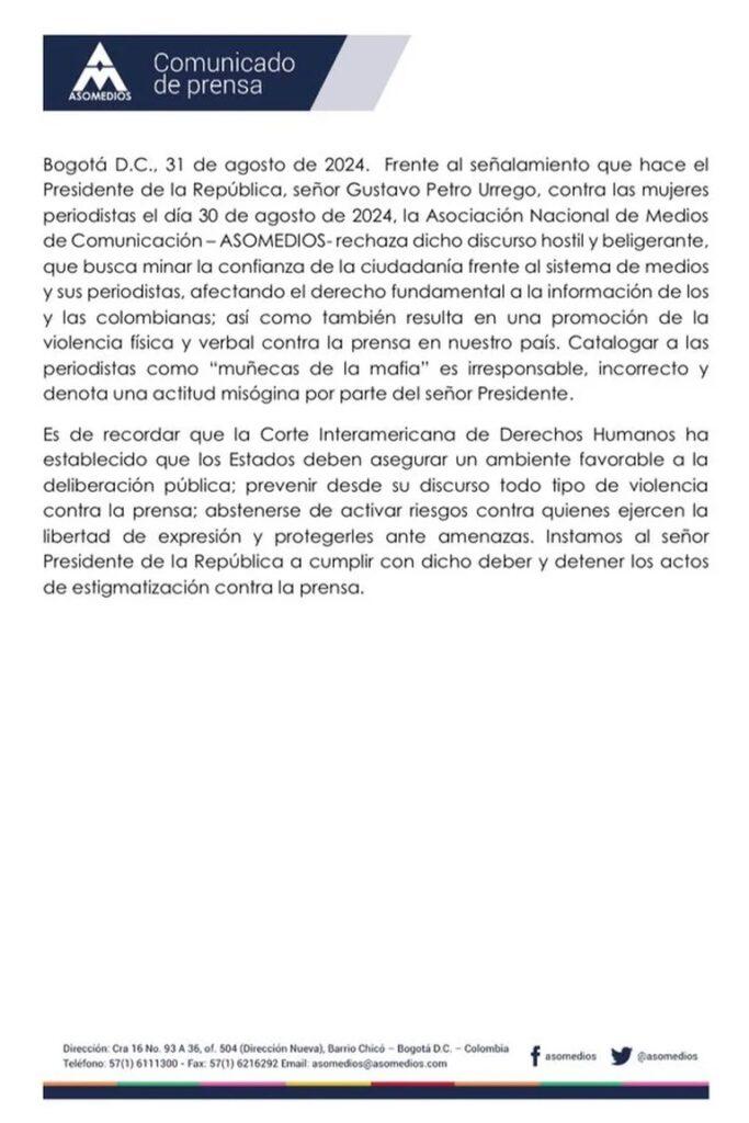 A su vez, Asomedios manifestó que “esto también resulta en una promoción de la violencia física y verbal contra la prensa de nuestro país. Catalogar a las periodistas como muñecas de la mafia es irresponsable, incorrecto y denota una actitud de misoginia por parte del presidente Petro”.