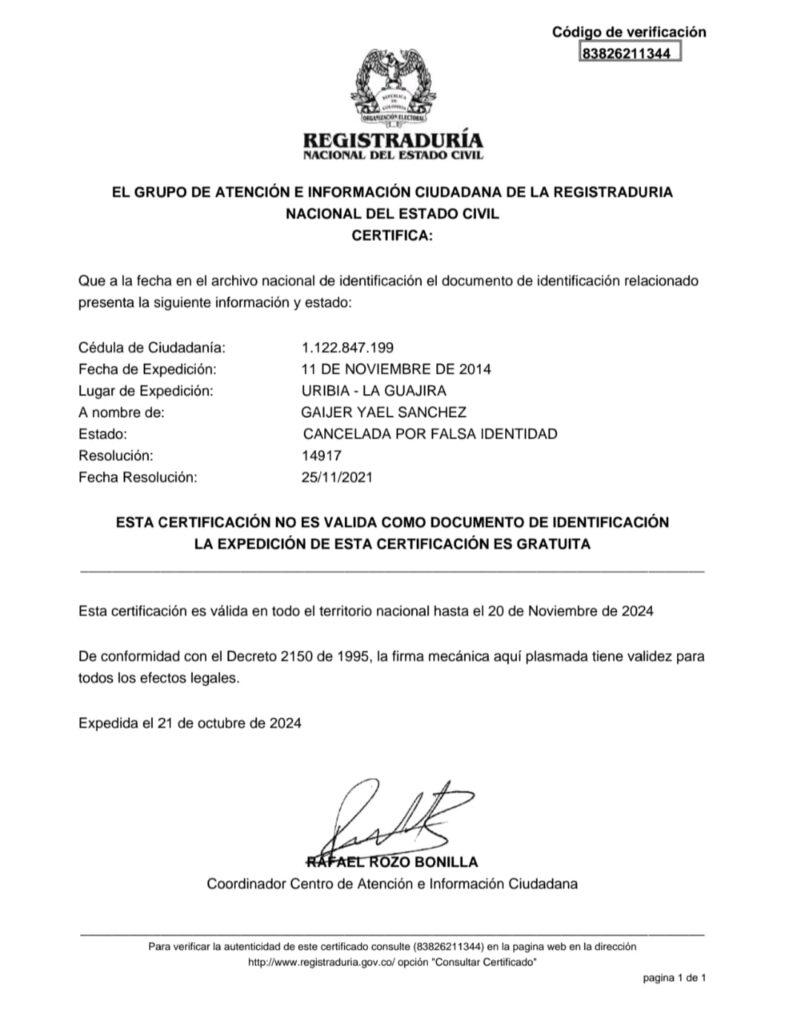 Dado que la cédula de ciudadanía es un documento público y su falsificación constituye un delito grave, se espera que las autoridades competentes, como la Fiscalía General de la Nación, abran una investigación de oficio para determinar las responsabilidades penales. La Superintendencia de Notariado y Registro también podría intervenir, dado su rol en la supervisión de los registros de identificación y su potestad para anular documentos fraudulentos.