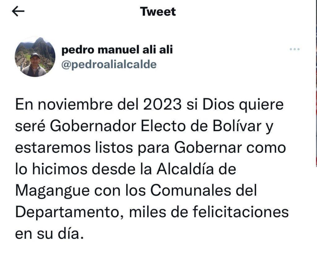 “En noviembre del 2023, si Dios quiere seré Gobernador Electo de Bolívar y estaremos listos para gobernar como lo hicimos desde la Alcaldía de Magangué, con los comunales del Departamento, miles de felicitaciones en su día “.