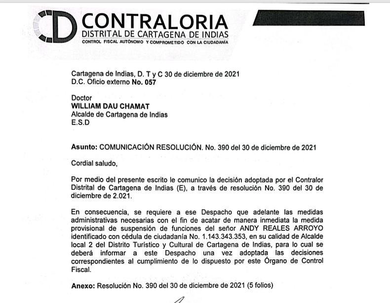 A través de la Resolución 390 del 30 de diciembre de 2021 el contralor distrital (e) Rafael Ignacio Castillo Fortich le solicitó al alcalde mayor de Cartagena, William Dau Chamatt, suspenda al alcalde local Andy Reales, mientras culminan las investigaciones y procesos fiscales que se vienen adelantando en su contra. Con la medida solicitada el representante del ente de control pretende que Reales no entorpezca las indagaciones que se vienen adelantando.