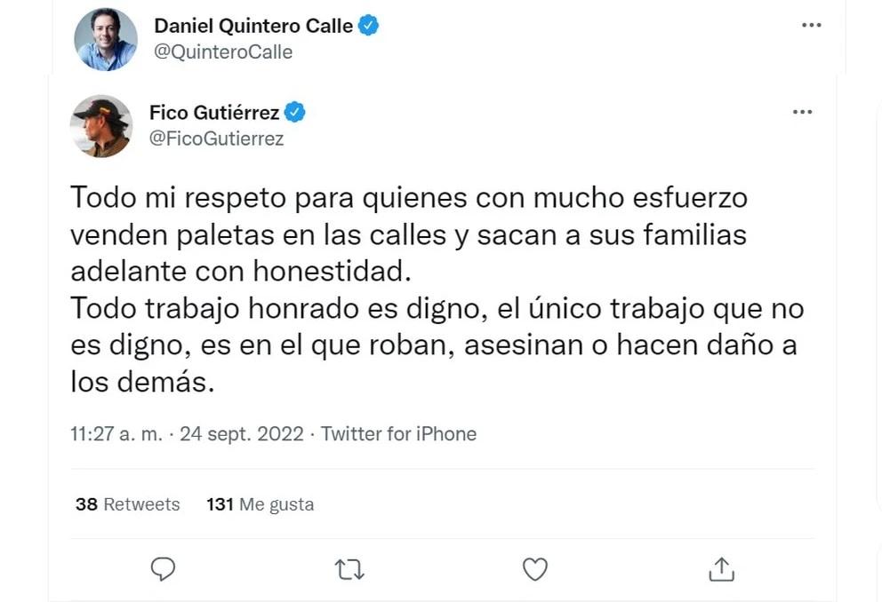Luego de la respuesta del gobernante paisa, Gutiérrez volvió a pronunciarse al respecto y le salió al paso a su predecesor en la alcaldía. En otro trino y sin mencionar a Quintero en ningún momento dijo que sentía respeto por la gente que se ganaba la vida vendiendo paletas y, de nuevo, le tiró pullas por el contrato en el que el alcalde no tiene nada que ver. “Todo mi respeto para quienes con mucho esfuerzo venden paletas en las calles y sacan a sus familias adelante con honestidad. Todo trabajo honrado es digno, el único trabajo que no es digno, es en el que roban, asesinan o hacen daño a los demás”, expresó Gutiérrez en otra publicación en la red social.