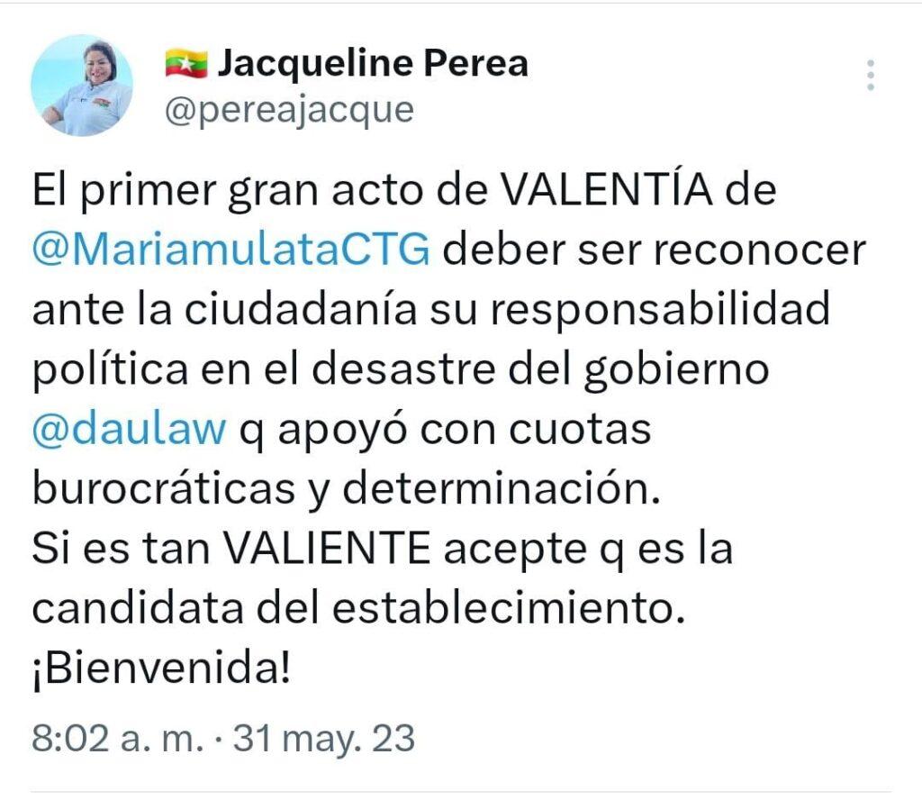 La precandidata Jaqueline Perea se fue lanza en ristre hoy en sus redes contra Judith Pinedo, conocida como la Mariamulata retándola a que reconozca, según ella, que es la candidata del establecimiento o de William Dau. Asegura Perea que uno de los primeros grandes retos que debería aceptar la Mariamulata es reconocer ante la ciudadanía su responsabilidad política en el desastre del gobierno del mandatario distrital actual. «Brindó total apoyo con cuotas burocráticas y determinación», asegura Perea.