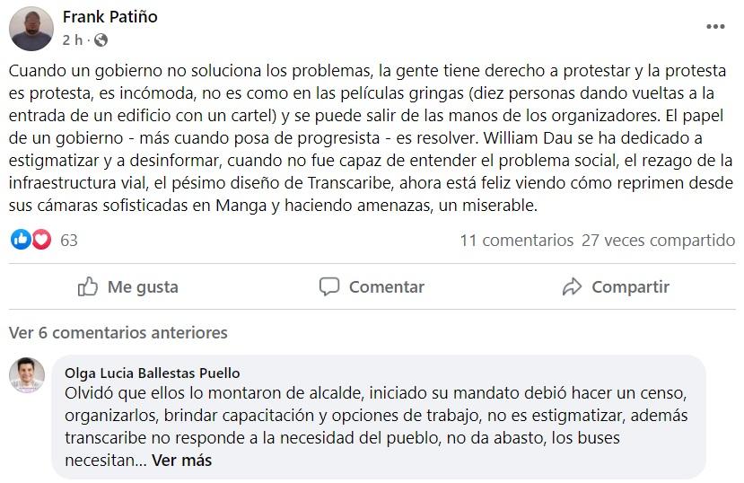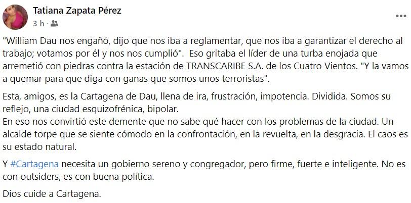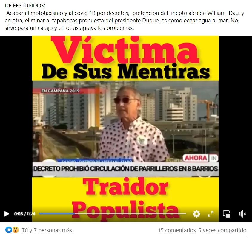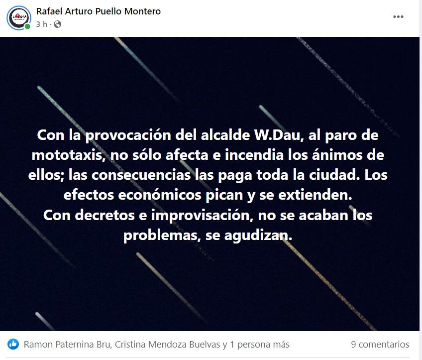Las redes sociales, que en el pasado eran el mayor aliado para el alcalde William Dau, se convirtieron hoy en la mejor manera para que los cartageneros se desahogaran al ver, según ellos, la manera tan mediocre y con falta de autoridad para manejar la crisis con el gremio de los mototaxistas. ESOVA NOTICIAS le dio un repaso a las redes sociales y, como se dice popularmente, Dau se llevó una palera de la que no sale bien librado. Estos son solo algunos ejemplos: