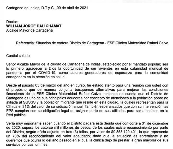 A la deuda que el Distrito afronta con la Maternidad se le suma también el calvario que ha tenido que afrontar por cuenta de la negativa para que las Entidades Prestadoras de Salud, Eps, se pongan al día. En una misiva dirigida al alcalde mayor de Cartagena, William Dau Chamat, los empleados de la entidad advierten que es necesario que se ponga al día la administración con el centro asistencial para evitar que, al igual que el año pasado, se vean abocados a dejar de prestar servicios esenciales para la población.