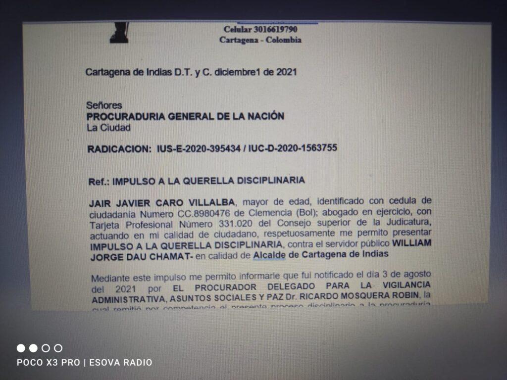 Ante la incertidumbre que se ha generado por parte del Ministerio Público para conocer una respuesta en torno al proceso que se le adelanta a Dau por el caso del maltrato a las directivas de la Universidad de Cartagena cuando dijo que eran un ‘nido de ratas’, el abogado Jair Caro decidió enviar un impulso a la Procuraduría que permita saber qué va a pasar con el mandatario en relación con este tema.
