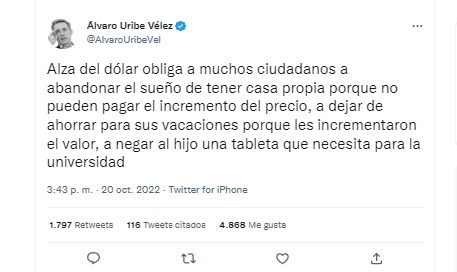 Este mismo jueves, Álvaro Uribe Vélez se pronunció en su cuenta de Twitter sobre el alza de la divisa. Concretamente el exmandatario dijo: