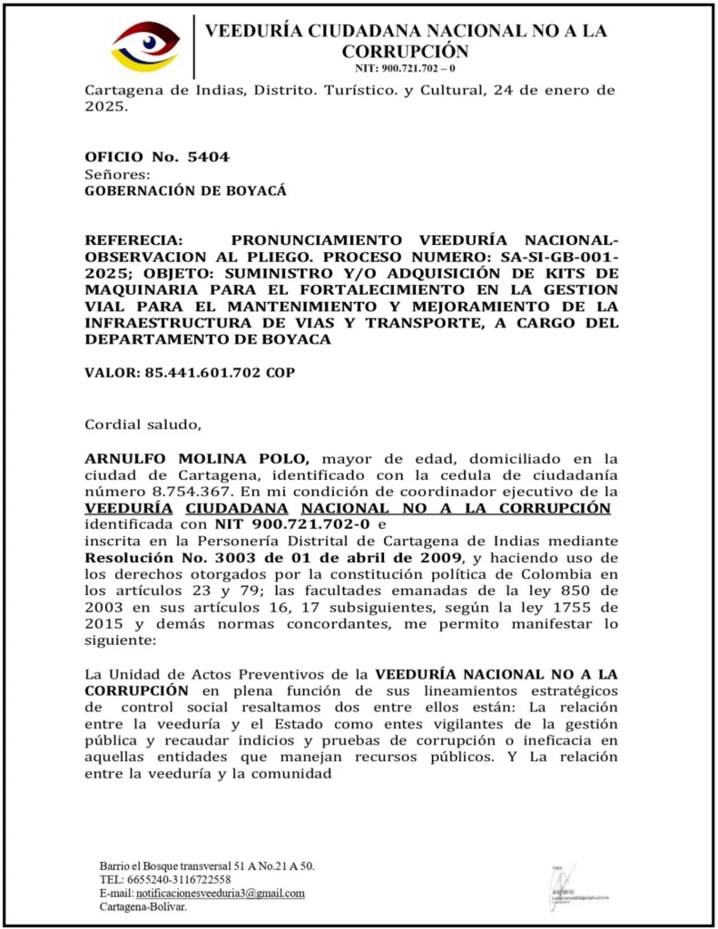 Estas son las OBSERVACIONES DE LA VEEDURÍA CONTRA LA CORRUPCION A LA GOBERNACIÓN DE BOYACÁ 2025.