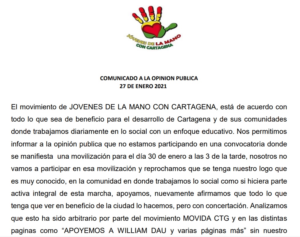 Concluyen que «analizamos que esto ha sido arbitrario por parte del movimiento MOVIDA CTG y en las distintas paginas como “APOYEMOS A WILLIAM DAU y varias páginas más” sin nuestro consentimiento irrespetando claramente el derecho al buen nombre. Y finalmente piden para esto la concertación.