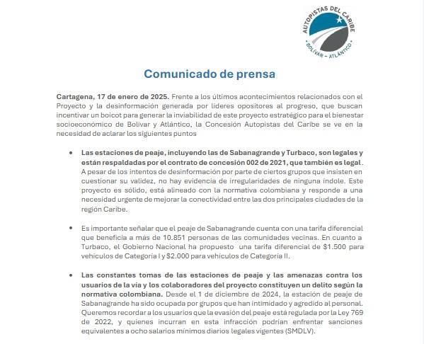 Frente a nuevas protestas que están programadas para este sábado 18 de enero, la concesión indicó que “las constantes tomas de las estaciones de peaje y las amenazas contra los usuarios de la vía y los colaboradores del proyecto constituyen un delito según la normativa colombiana. Desde el 1 de diciembre de 2024, la estación de peaje de Sabanagrande ha sido ocupada por grupos que han intimidado y agredido al personal”.