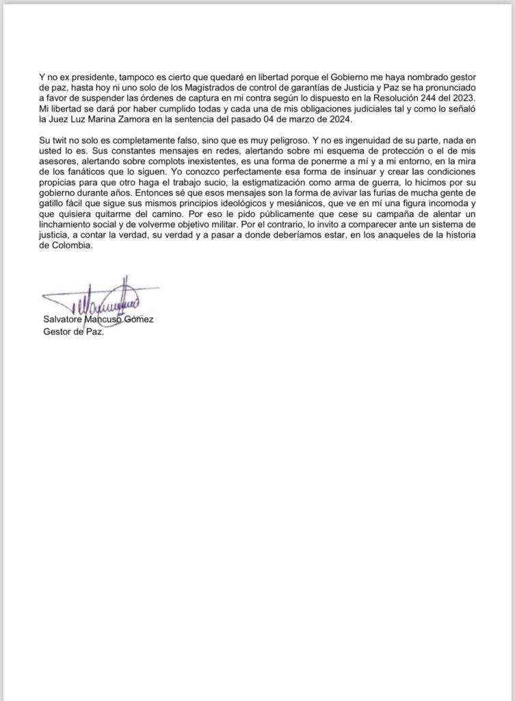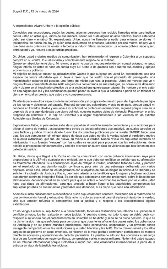 El exjefe paramilitar le dijo al expresidente que «no merece que yo ni ningún otro excomandante de las AUC vengamos a convertirnos en sus verdugos». «Su ocaso se va dibujando gris y bizarro en el imaginario colectivo de una sociedad que quiere pasar página: su nombre y el mío están en esa página que las y los colombianos quieren pasar, lo invito a que pasemos a partir de un tribunal de cierre en el cual es preciso que usted y yo comparezcamos», afirmó Mancuso.