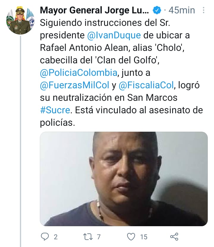 «En una operación realizada por nuestra Policía, se ha neutralizado a alias El Cholo, uno de los peores criminales de la estructura del Clan del Golfo y responsable de la masacre de cinco sucreños, el pasado mes de octubre», explicó el Ministro.