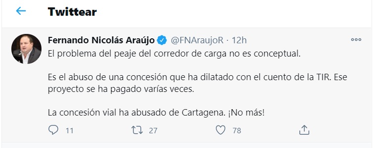 El Senador Fernando Araújo, ha sido el único que se ha pronunciado a través de las redes y recientemente lo hizo a través de su cuenta de Twitter al publicar el siguiente trino: