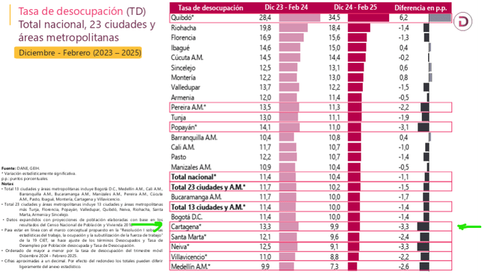 En los últimos meses, el panorama laboral de la ciudad ha mejorado de forma notable. Según el más reciente informe del DANE, la tasa de desempleo en Cartagena cayó al 9,9% en el trimestre diciembre de 2024 a febrero de 2025. Volver a cifras de un solo dígito no solo es alentador, es una señal clara de que se está haciendo algo bien. Es la tasa más baja para un febrero en los últimos cinco años. No se trata solo de una mejora puntual, sino de un cambio sostenido.