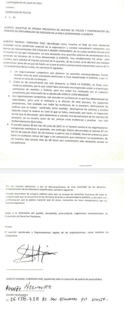 Los campesinos reclaman el amparo policivo por la posesión de la tierra que vienen haciendo desde hace décadas y que vienen siendo despojados por civiles que, al parecer, están armados y siembran el terror y el miedo en toda la zona. El llamado es hoy para el presidente electo Gustavo Petro para que, a través del Ministerio de Agricultura vuelque sus ojos hacia y permita que estas tierras vuelvan a ser productivas y se le de cumplimiento a su programa de gobierno.