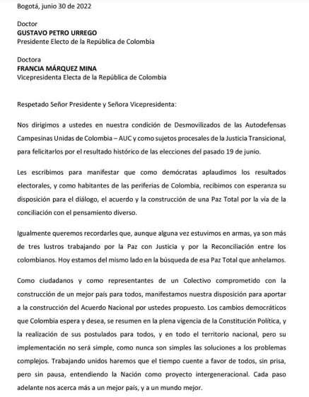 En la carta, los exparamilitares manifestaron su disposición de crear planes para el país de la mano con el nuevo gobierno. El mensaje enviado a Petro muestra la intención de participar en el llamado «Acuerdo Nacional» que: