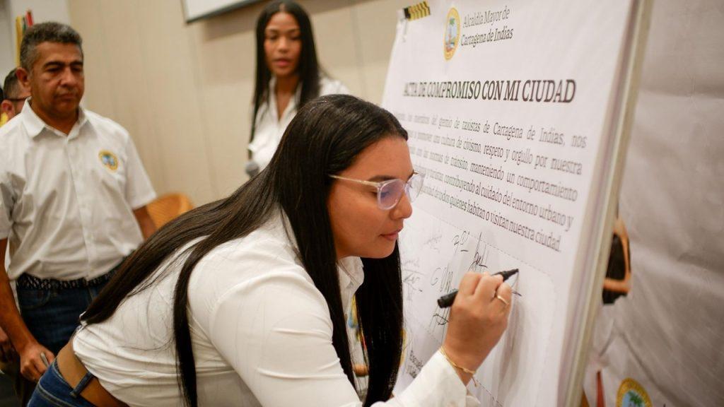Como parte del acto, se realizó la firma colectiva del compromiso “Soy Embajador Turístico de Cartagena”, con la participación de los representantes del gremio de taxistas: Frank Sánchez, Gilberto Villamil y Félix Barrios, junto a funcionarios distritales, ediles, academia y gremios de taxistas.