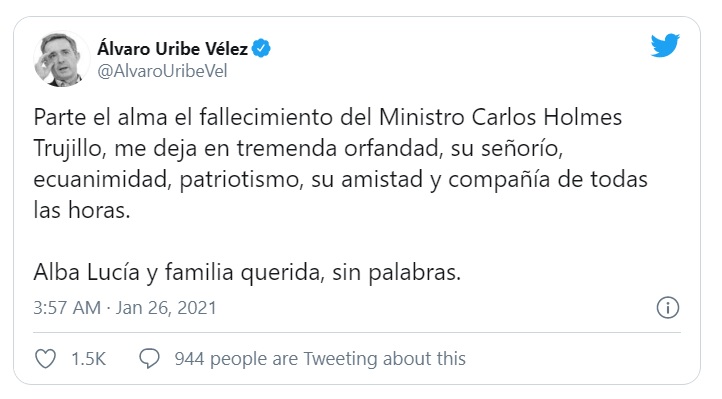 El expresidente Álvaro Uribe lamentó su fallecimiento y trinó:
